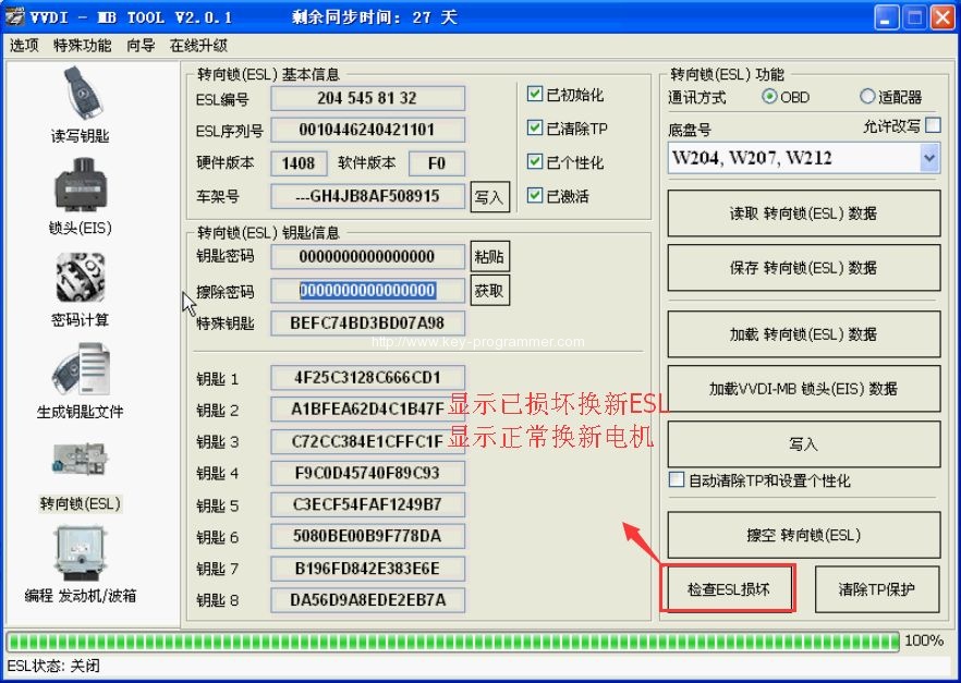 Open VVDI MB Tool software. Click “Check ESL damage status”.