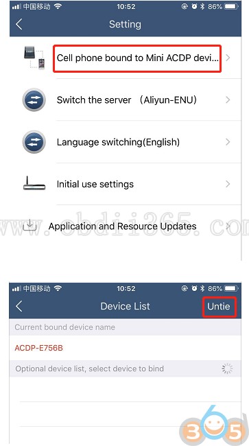 Connect the ACDP device with a cell phone first, and confirm that the connection is normal (Picture 1). That is, the ACDP device and the phone are connected to the same WIFI. Then exit the APP or untie the device in “Cell phone bound to Mini ACDP device ” (Picture 2 – Picture 3), so that the ACDP device can be bound and connected by another device (PC).