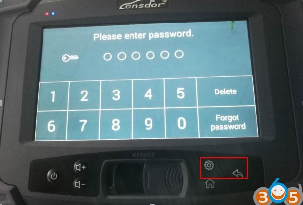 Step 1: After rebooting the Lonsdor K518 key programmer, please press and hold the setting and return buttons(marked with a red box) simultaneously for a few seconds..