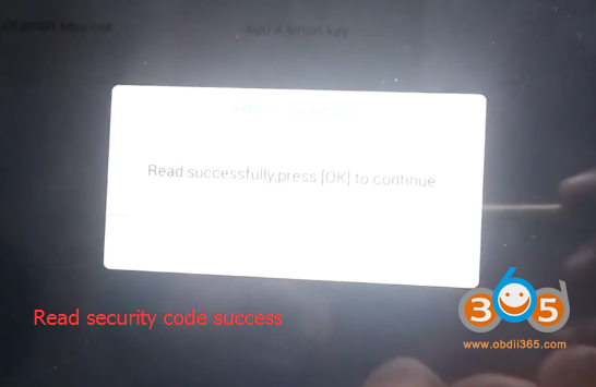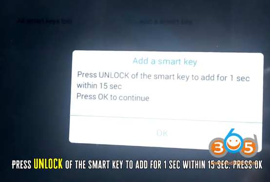 Press UNLOCK button of the smart key to add for 1 sec within 15 sec, press OK to continue