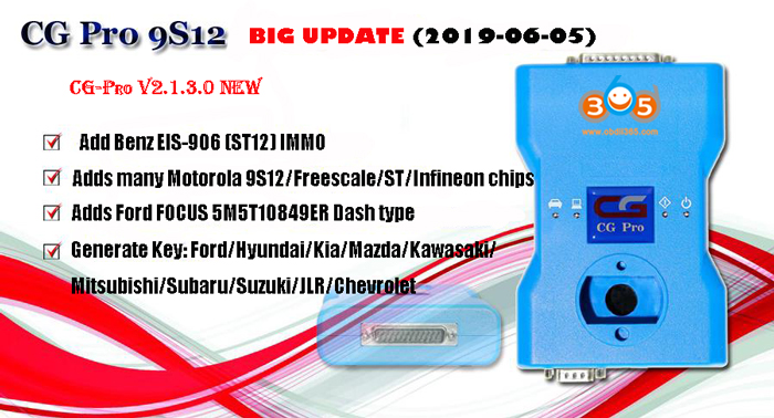 Good news!!! CG Pro 9S12 Programmer released a big update on June 5th, 2019. CG-Pro V2.1.3.0 software adds lots of chip types, Benz EIS-906 (ST12) IMMO and lots of key generation models, i.e Ford, Jaguar, Chevrolet, Hyundai, Kia, Mazda, Kawasaki, Mitsubishi, Subaru and Suzuki.
