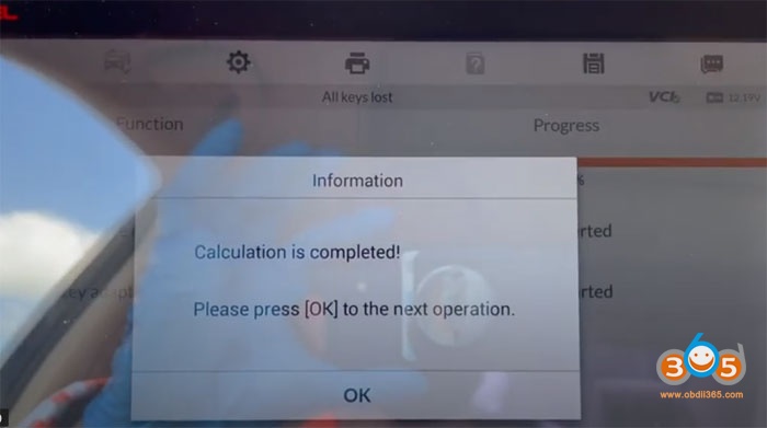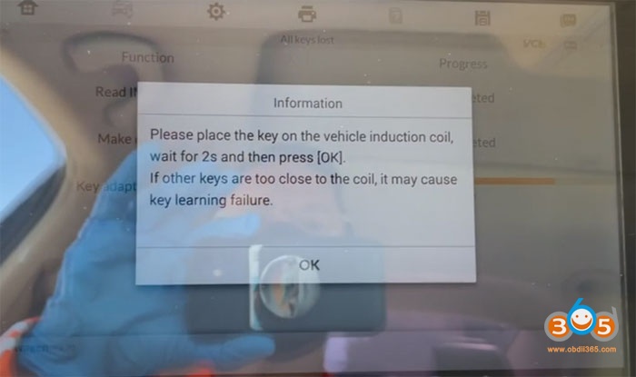 Place the key on the vehicle induction coil, wait for 2s and then press OK