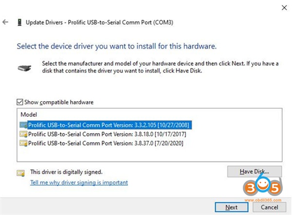 Step 5: Select the older version of the driver file in the list (i.e 2008 version)