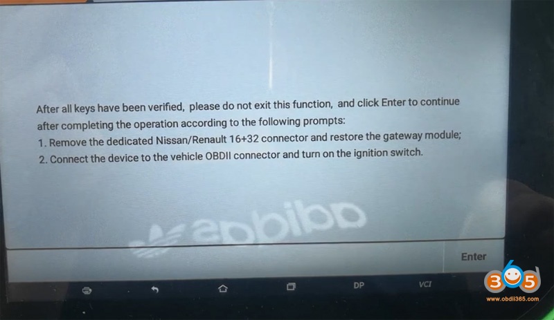 After all keys have been verified do not exit this function, remove the dedicated Nissan bypass cable and restore the gateway module.
