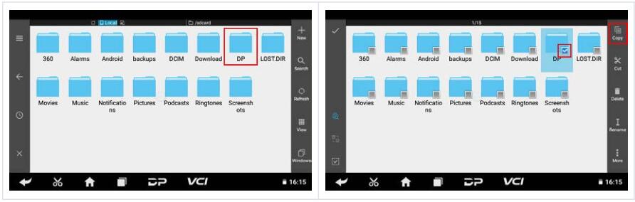3. Locate and long press the DP folder, select DP folder and click on the Copy button
