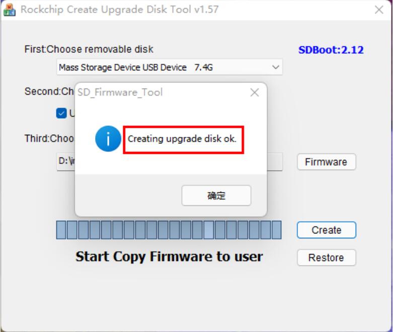 4. Wait for the prompt Creating upgrade disk ok. The upgradable TF card is made successfully.