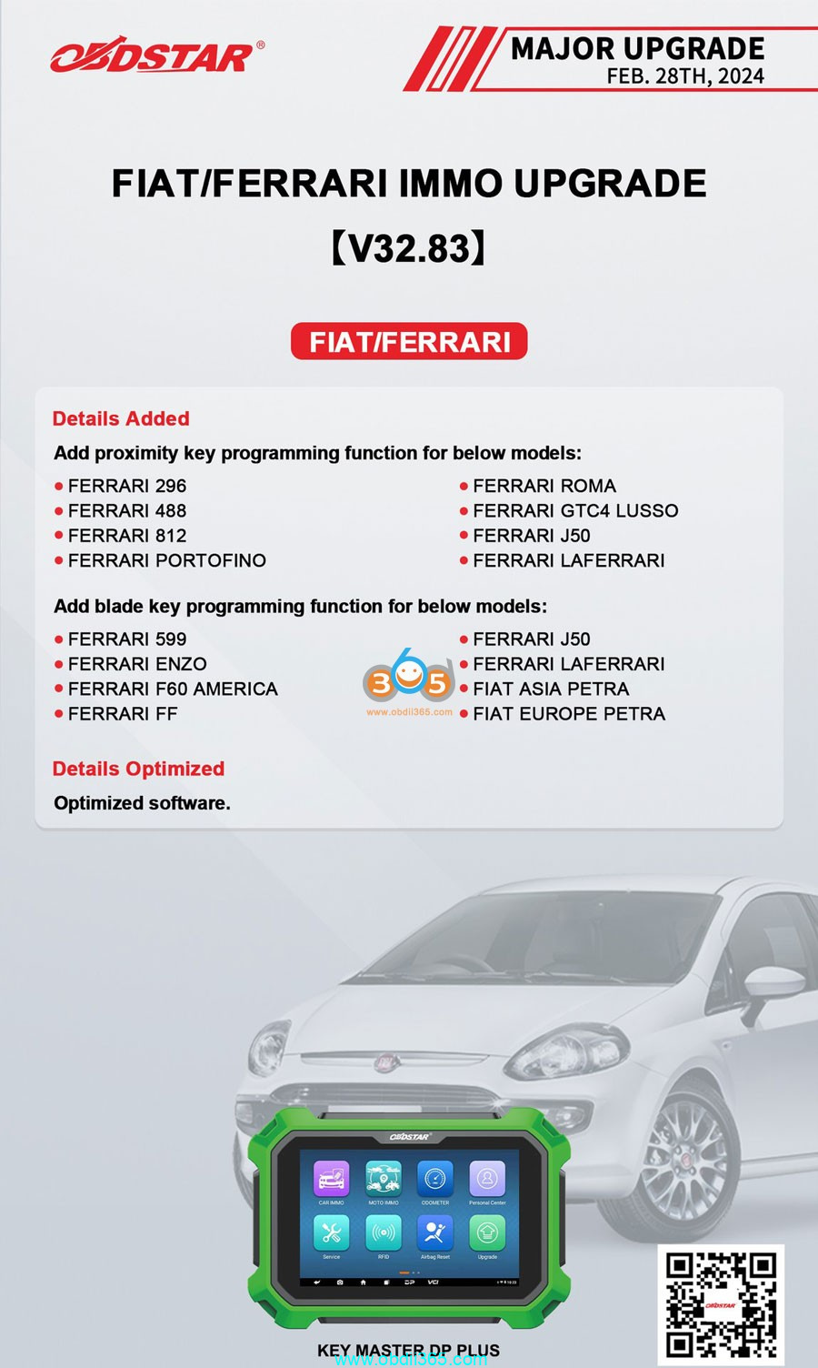 OBSDTAR X300 DP Plus and Key master DP Plus released new FIAT FERRARI IMMO software [V32.83] on March 1st, 2024.
