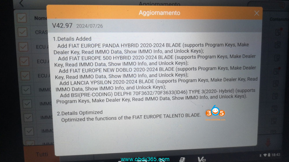 Add FIAT EUROPE PANDA HYBRID 2020-2024 BLADE (supports Program Keys, Make Dealer Key, Read IMMO Data, Show IMMO Info, and Unlock Keys);