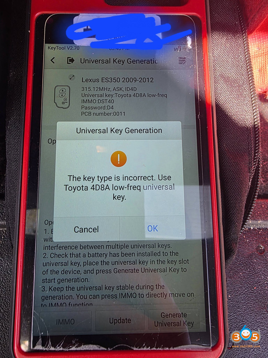 When i tried to generate Lexus es350 key today Autel KM100 is giving me error.